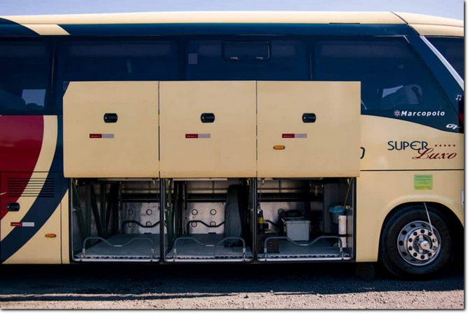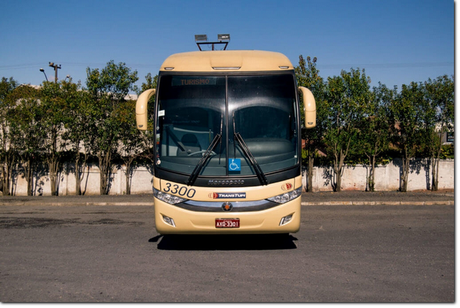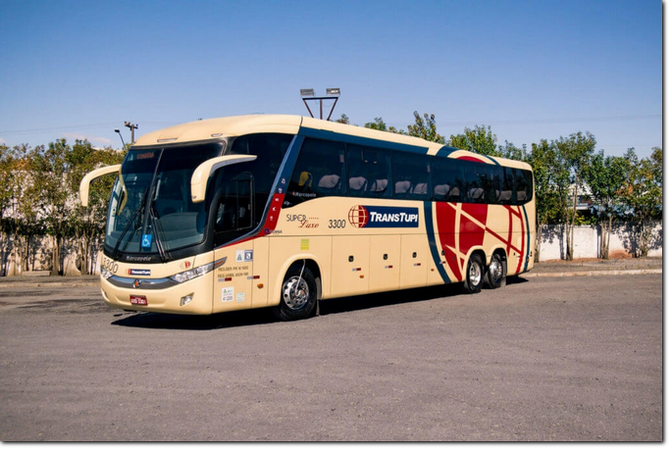 Veículos de 38, 42 e 46 lugares (2 eixos) e 42 e 46 lugares (3 eixos), todos com Monitor de TV, DVD, Radio com CD, Microfone, Frigobar, Ar Condicionado, Poltrona com Apoio de Pernas, Toalete e Mesa de Jogos.